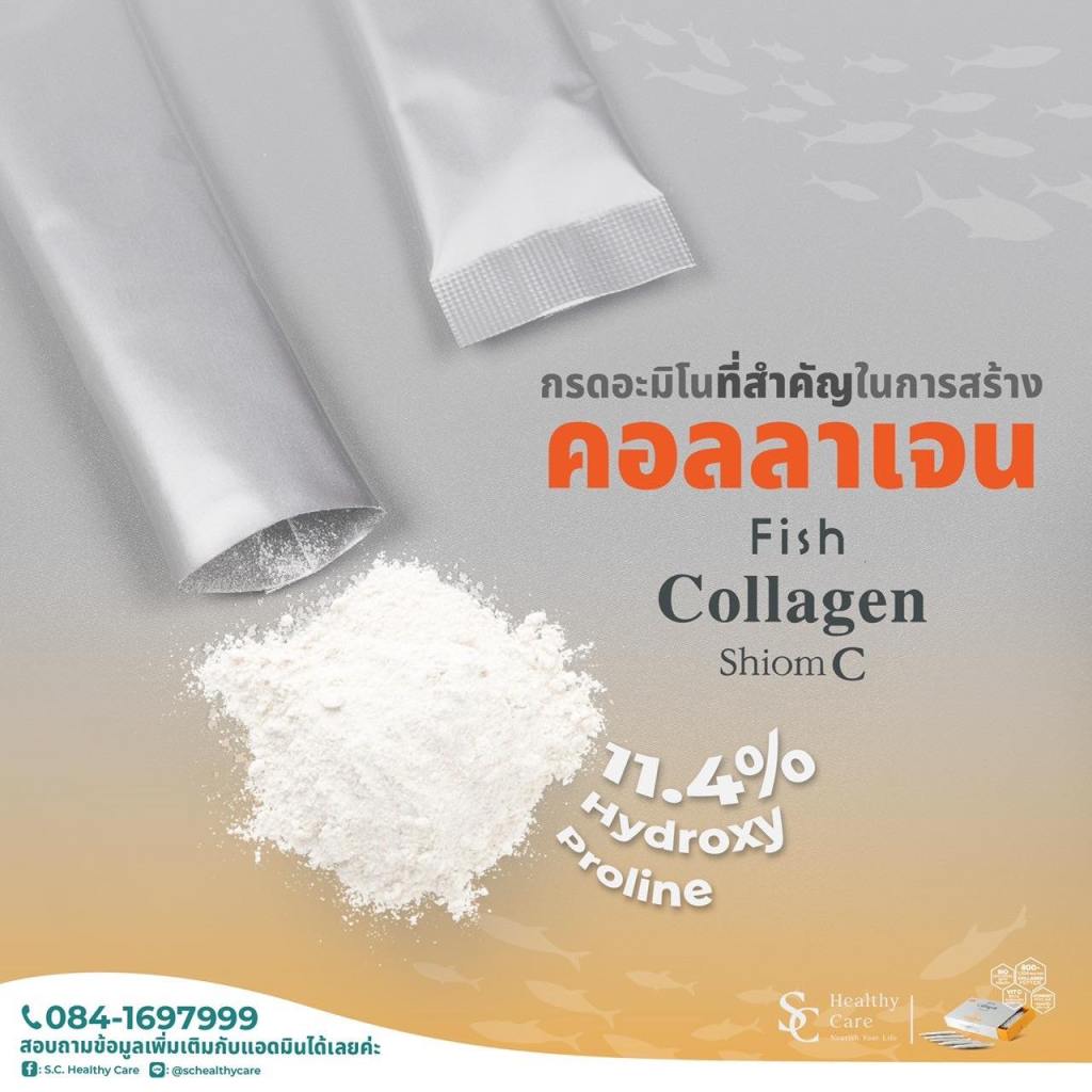 🐟 🧡 ฟิชคอลลาเจน ชิโฮมห์ซี อุดมไปกรดอะมิโนที่สำคัญในการสร้างคอลลาเจน และคัดเฉพาะโมเลกุลขนาดเล็ก 800-1200 dalton ประกอบด้วยไกลซีน (Glycine) โพรลีน (Proline) และไฮดรอกซีโพรลีน (Hydroxyproline) สูงถึง 11.4 ทำให้สายคอลลาเจนแข็งแรง คงทน และเสื่อมสลายช้า เพื่อใช้ในการสร้างคอลลาเจนที่เป็นองค์ประกอบสำคัญถึง 1 ใน 3 ของร่างกายมนุษย์